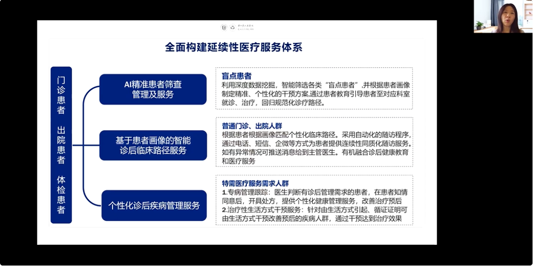 针对门诊后、出院后、体检后的非在院患者,浙江省人民医院全面构建延续性医疗服务体系,其中针对盲点患者提供AI精准患者筛查管理及服务、针对普通门诊&出院人群提供基于患者画像的智能诊后临床路径服务、针对特需医疗服务需求人群提供个性化诊后疾病管理服务。