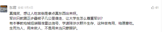 另外,@东君老师则认为军训只教踢正步、叠被子和“几公里傻走”确实是在没苦硬吃。