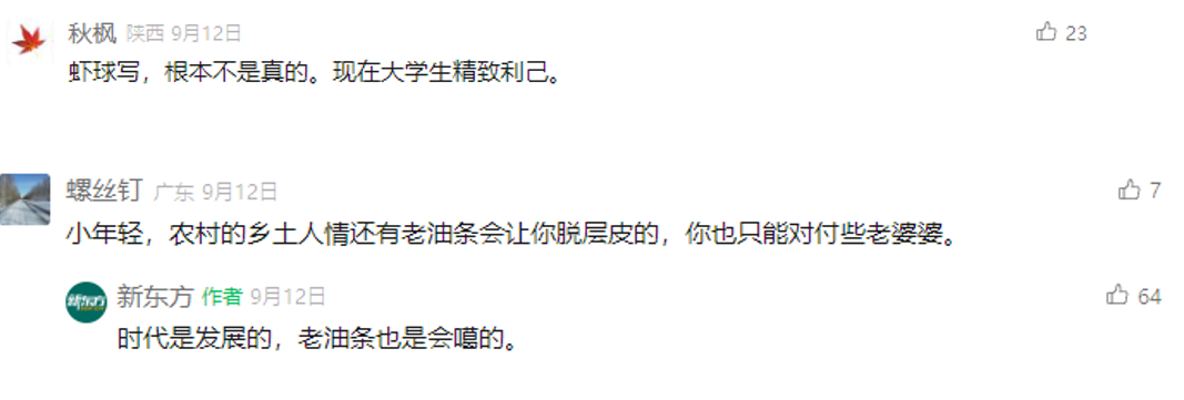 很有趣的是,评论区里关于大学生村官的评价分为两派: