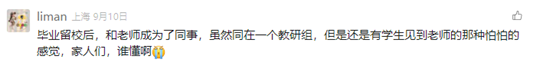 比如@liman老师,毕业后留校,和自己的老师成为了同事,还在同一个教研组。