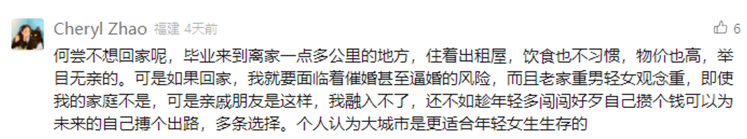 在外面租房花销大,吃不习惯也住不好。但回老家要被逼婚,而且亲戚朋友还有重男轻女的倾向。