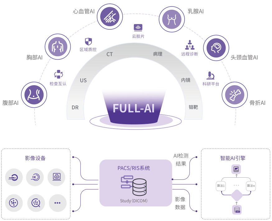 FULL-AI-IMAGE平台遵循DICOM、HL7、IHE等国际技术标准,全面服务于放射、超声、内镜、病理、心电、核医学等多医技科室。该平台以医生、管理者和患者的需求为核心,整合影像集中存储与调阅、专科诊断工作站、业务流程信息化、AI辅助诊断、云胶片、临床系统交互、绩效与质控管理等关键服务。