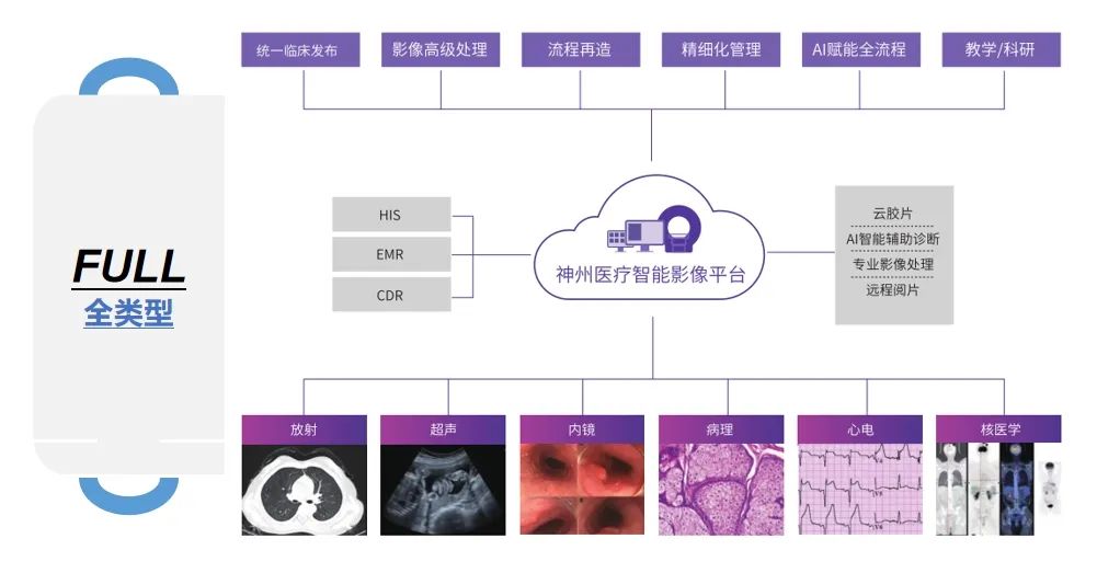 FULL-AI-IMAGE是基于神州医疗大模型、多模态AI技术以及先进的医疗大数据技术打造的“全类型”“全场景”“全维度”智能影像平台。该平台整合了临床常用的AI辅助诊断技术,覆盖日常诊断、影像质量控制、区域医疗协同以及云胶片服务等关键应用流程,致力于优化诊疗流程、提升疾病诊断的效率与准确性。