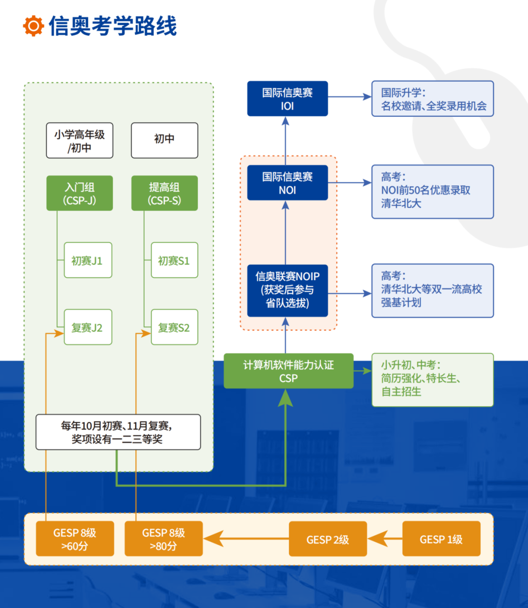 我们还为学员规划了信奥成长路线,让学员从CSP-J/S开始进行学习和训练,运用所学知识配套考试技巧,争取斩获信奥奖项。