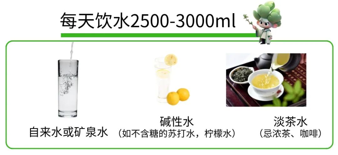 尿酸主要通过肾脏排泄,当人体摄入足够的水分时,会增加尿量,从而促进尿酸的排出,有助于降低血尿酸水平[3]。高尿酸血症与痛风人群,在心、肾功能正常情况下应当足量饮水,每天建议2000~3000mL。尽量维持每天尿量大于2000mL[2]。在饮水类型上,建议选择白开水、矿泉水、碱性水(如不含糖的苏打水)或淡茶水作为主要的饮用水。建议二:多样化的饮食结构