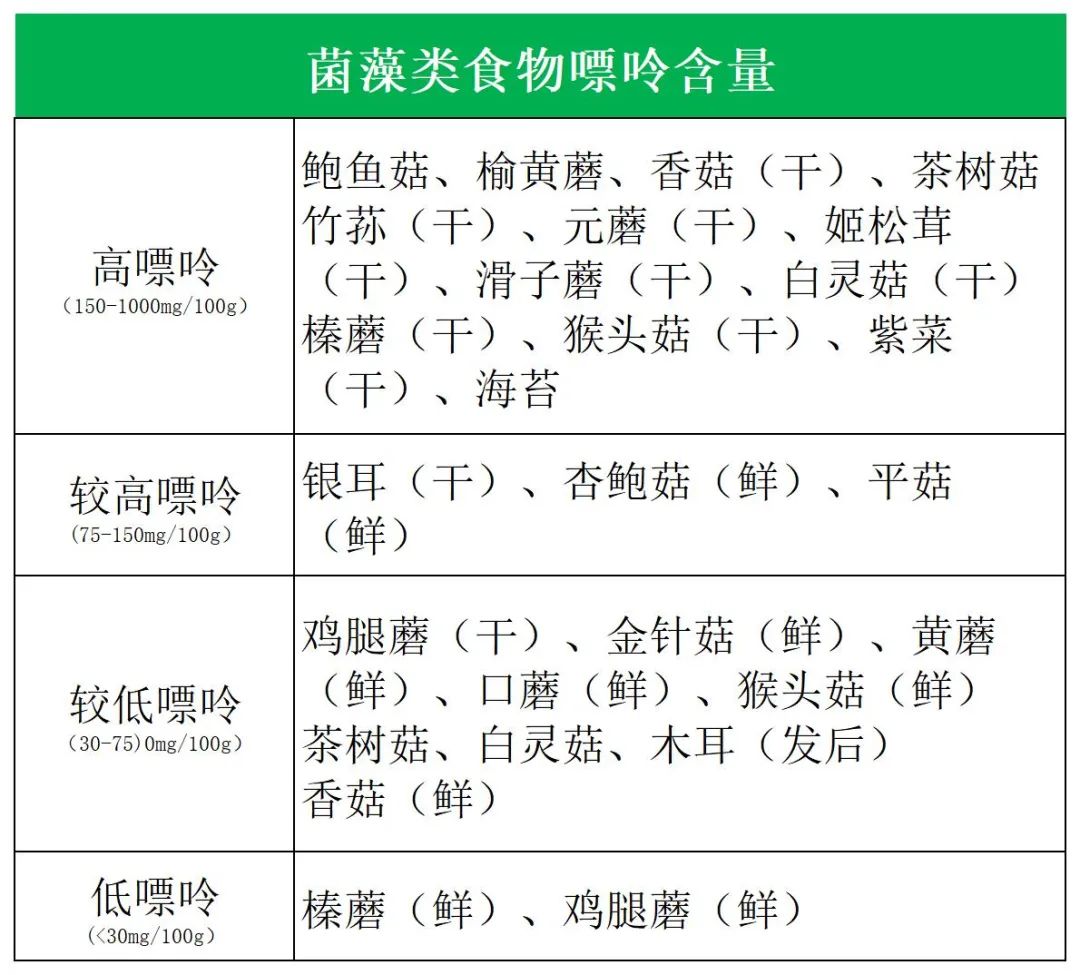 警惕菌藻类中的高嘌呤选手,比如干的鲍鱼菇、榆黄蘑、茶树菇、竹荪、猴头菇、香菇、紫菜等,属于高嘌呤食物,要少吃;但鲜的鸡腿蘑、榛蘑、香菇、金针菇、口蘑,嘌呤含量较低,可以适量食用。