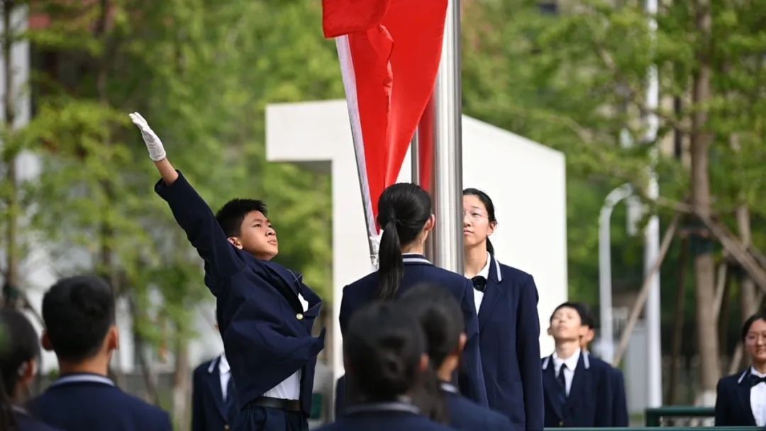 随着国歌的激昂旋律响起,五星红旗在十一石景山的校园上空缓缓升起,它在晨光的照耀下显得格外鲜艳,仿佛是天空中最耀眼的星辰。
