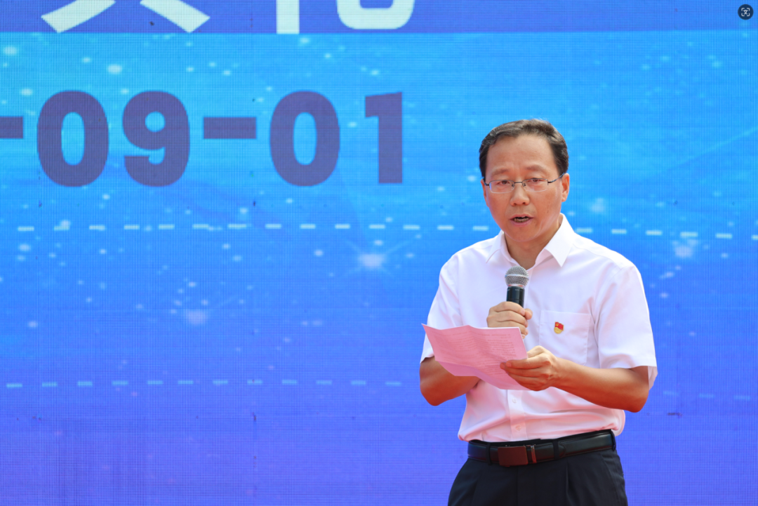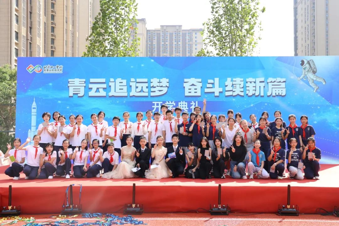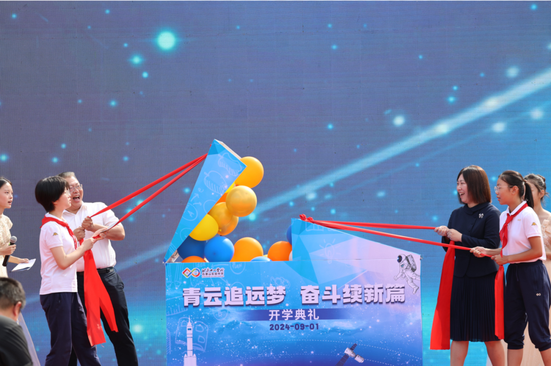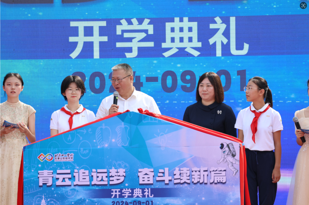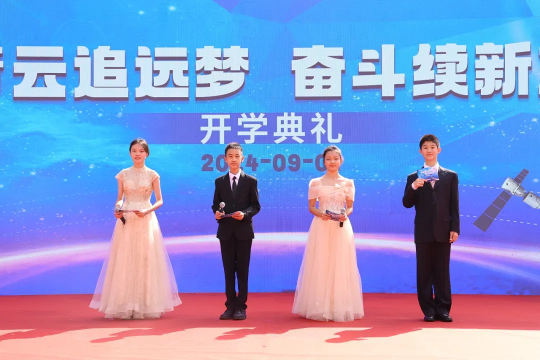 随着那激昂的歌声渐渐落下,主持人刘珞涵、杨笔麟、张若初和刘增一走上舞台,共同宣布北京市十一学校石景山实验中学2024-2025学年度“青云追远梦,奋斗续新篇”主题开学典礼正式开始!