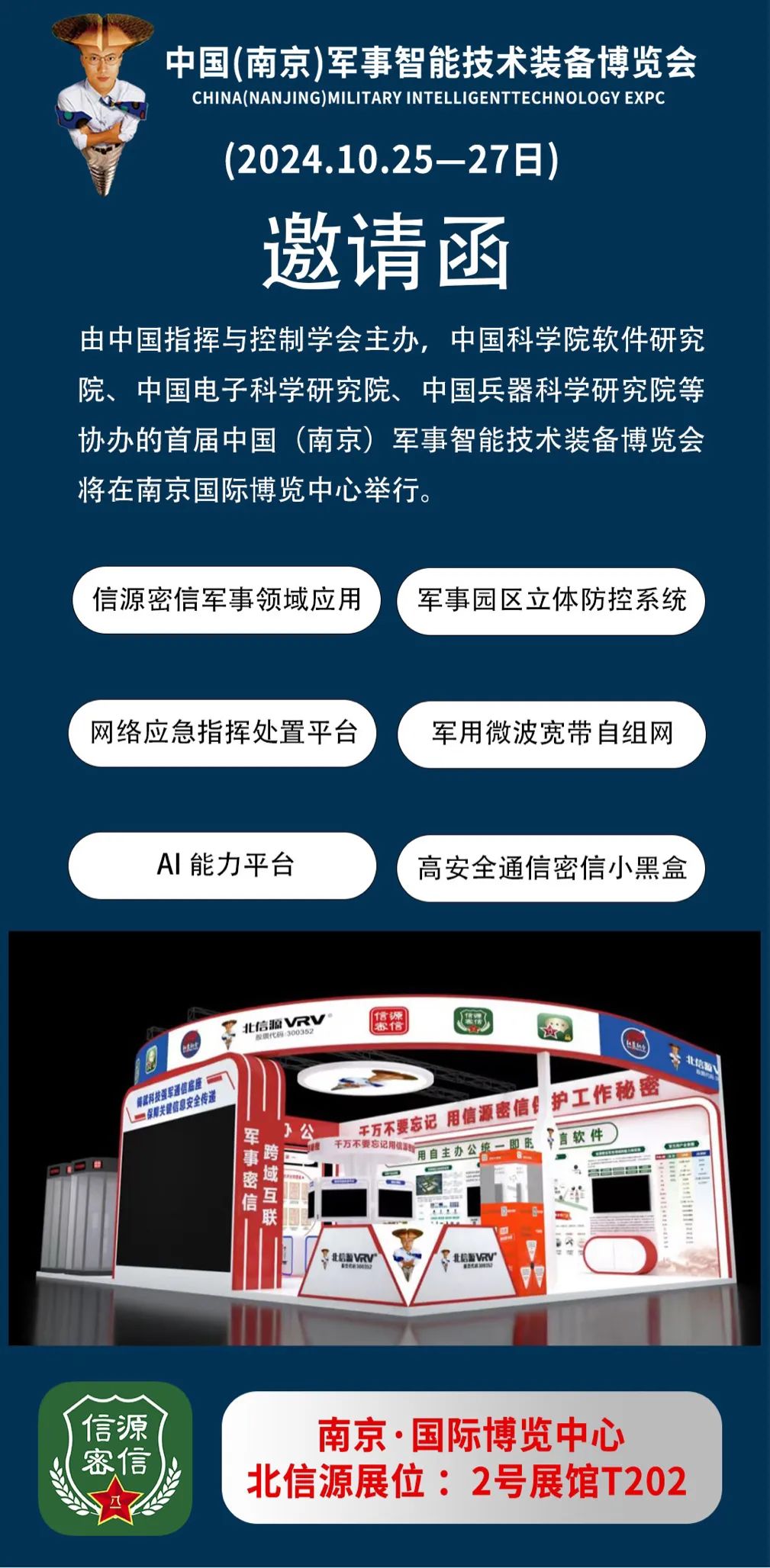 2024年10月25日至27日,由中国指挥与控制学会主办,中国科学院软件研究院、中国电子科学研究院、中国兵器科学研究院等协办的首届中国(南京)军事智能技术装备博览会在南京国际博览中心盛大举行。