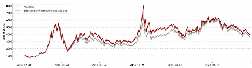 如果将鹏扬元合量化大盘优选股票基金的业绩比较基准与中证A500进行拟合,就可以发现:近20年来,中证A500指数与鹏扬元合量化大盘优选股票基金比较基准的日度收益率相关系数高达98.6%。