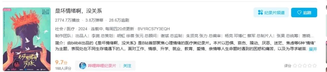 在刚刚过去的10月,B站推出了一个纪录片,叫做《是坏情绪啊,没关系》。