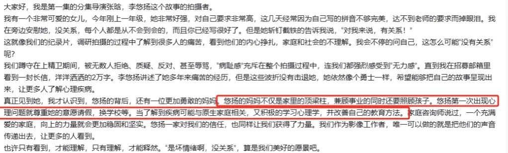 在评论区里,纪录片的导演介绍说,悠扬妈妈是家里的顶梁柱。