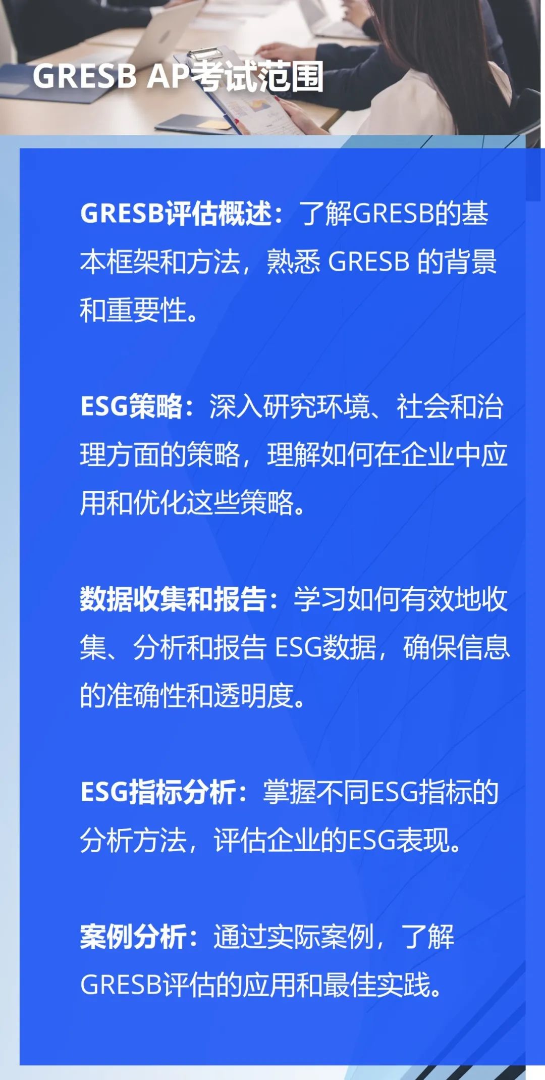 对于个人而言,在全球ESG领域的职业竞争中,该证书能给您带来明显优势,这能推动您的职业发展,体现您在可持续性和治理方面的专业水平。
