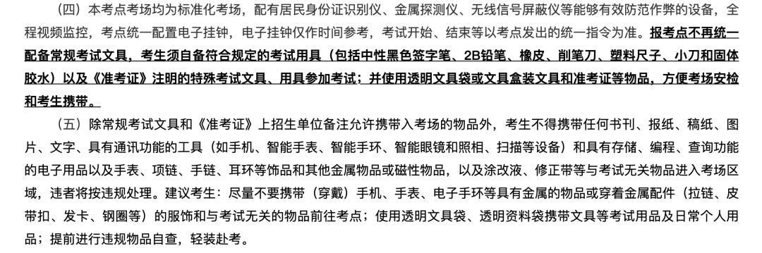 不过也有报考点会提前通知是否自备文具,如广西艺术学院考点,规定了考生需要自带的文具清单,以及不得携带的东西举例: