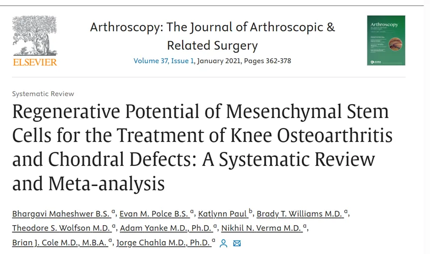 例如,美国芝加哥市拉什大学相关研究人员在Arthroscopy杂志发表了研究成果,系统评价了近20年来间充质干细胞治疗膝骨关节炎和软骨缺损的研究[8]。结果表明,间充质干细胞治疗可以显著改善软骨体积,改善患者功能。