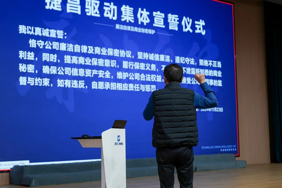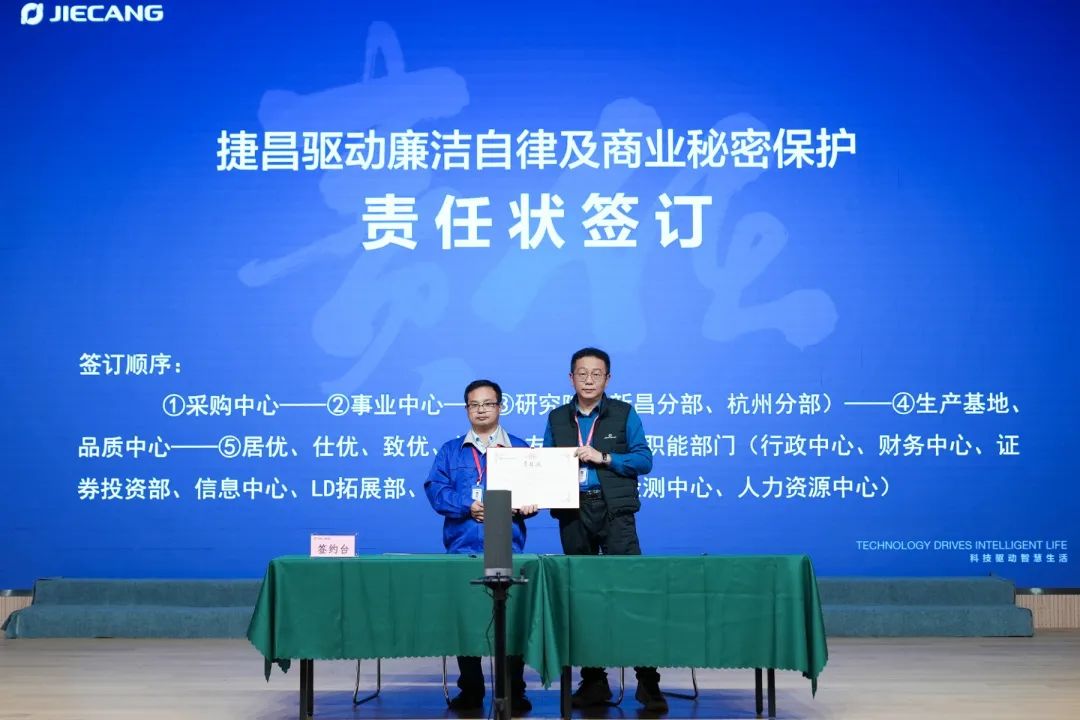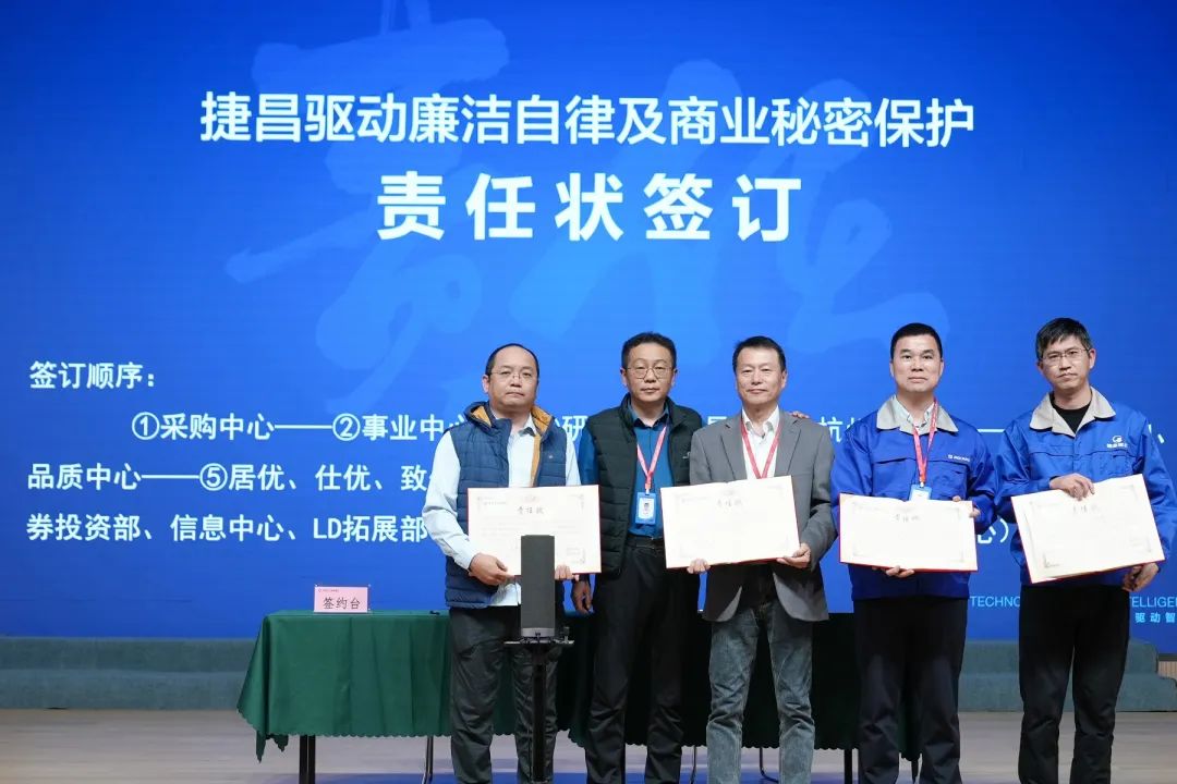 承诺是金,熠熠生辉。在培训会后期,全体与会人员对自身的廉洁自律及商业秘密保护行为的履行作出庄重宣誓,并以各部门负责人为代表依次上台签订责任状。事前预防永远优于事后救济,全体捷昌人均需不断强化自身廉洁自律意识,筑牢公司商业秘密保护防线。