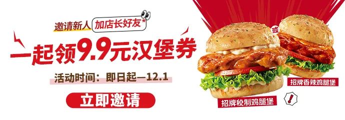 2、活动规则:必胜客会员可分享链接邀请好友添加必胜客店长企业微信账号为好友,好友受邀依照前述方式添加店长企微好友的即视为成功邀请。成功邀请1位好友的,则邀请人可领取1张9.9元享招牌秘制鸡腿堡 或 招牌香辣鸡腿堡1份的优惠券,凭券即可以9.9元选购相应产品1份。