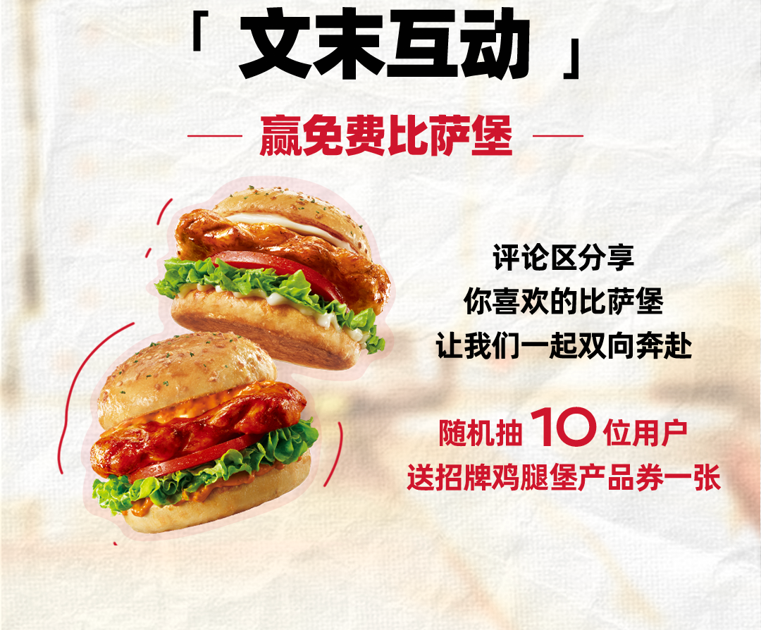 评论区抽奖活动时间:2024年11月25日至2024年11月28日。奖项设置:0元享招牌鸡腿堡兑换券(单品价消费满19元可享),以下简称为“鸡腿堡兑换券”,共计10份;活动方式:活动期间,关注必胜客官方微信,通过在本推文评论区留言,即视为参与活动,有机会获得以上奖项。抽奖方式:2024年11月29日中午12点,主办方将从成功参与活动的用户中随机抽取10位,各送出鸡腿堡兑换券1张。注:同一微信/微博用户不可重复获奖。