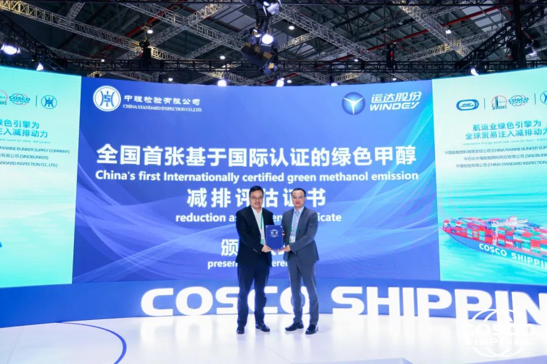 11月6日,在第七届中国国际进口博览会、中远海运集团召开的“航运绿燃引擎为全球贸易注入降碳动力”主题沙龙上,中理检验正式向运达股份邯郸绿色甲醇项目颁发了基于ISCC体系的全生命周期碳减排认证,这是继9月获得全国首张以农场/种植园为原点的绿色甲醇原料端ISCC EU证书以来,运达股份新能源消纳解决方案再度获得权威认可。运达股份党委副书记、总经理程晨光出席仪式。