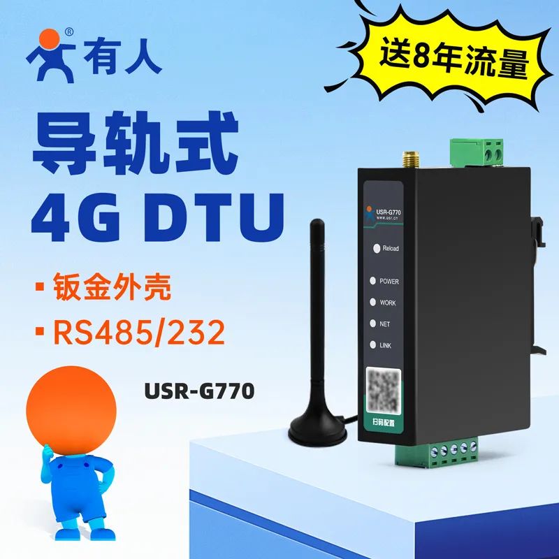 为让老客户平稳度过切换期,有人物联向2G DTU用户推荐切换钣金导轨4G DTU G770,G770支持四大运营商(移动、电信、联通、广电)4G网络,免费赠送八年流量,每月100M。