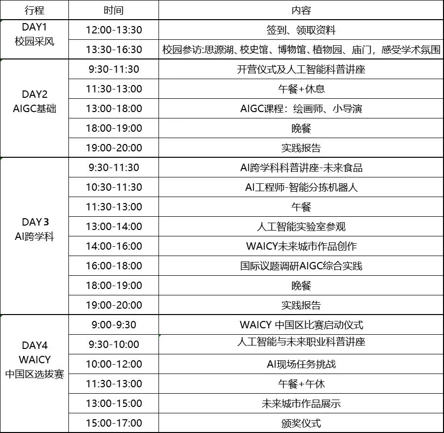 为了保证学员们拥有实打实的学习收获,本次赛事营采用学科小组精细化学习模式,每个小组还配备了专业助教。助教们将全程陪伴学员们的学习旅程,及时解答疑问,协助小组开展讨论与项目实践,确保每位学员都能在小组协作中充分发挥自身优势。尤为重要的是,学员们在营期间创作的作品,还将有机会参与WAICY世界人工智能大赛以及全国青少年人工智能创新活动。学得怎么样,比一比就知道!WAICY赛事让孩子们有机会与国内外优秀同龄人同场竞技,以便在过程中收获荣耀、汲取经验、发现不足、不断提升。此外,专家们还会为学员们提供关于国际学术交流和职业规划方面的指导。在营地活动的第4天,孩子们将携作品直接参加第8届WAICY世界青少年人工智能大赛国际赛的中国区选拔赛活动,斩获重量级赛事荣誉。WAICY 世界青少年人工智能大赛(World Artificial Intelligence Competition for Youth) 是一项竞赛活动,2018年在美国匹兹堡首次举办。