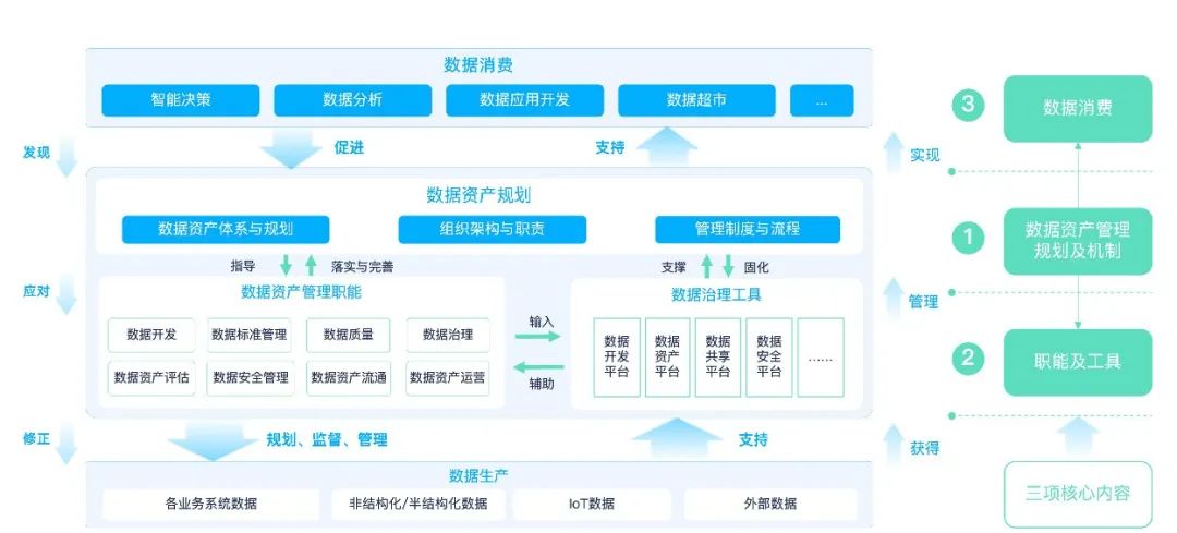 要实现数据要素的市场效能,真正发挥数据生产要素的作用,离不开数据资产化,而数据资产化自然也离不开数据资产管理这一基础工作。数据资产管理是释放数据要素价值、推动数据要素市场发展的重要前提。全面有效的数据资产管理体系,为规范数据资产的采集、加工、使用过程,建立数据资产生态,持续运营数据资产,以及政府机构与企事业单位在资产计量确认方面提供良好的数据条件和能力基础。为了帮助各大企业解决数据资产管理的问题和困境,袋鼠云汇聚了多位一线大数据专家,精心编撰了《数据资产管理白皮书》,围绕数据资产管理的相关职能,阐述数据资产管理的概念内涵、实施路线与平台工具,并借助行业实践案例解析,为读者提供数据资产管理新思路。完备的企业数据资产管理体系,首先依赖于数据资产管理规划及机制等上层设计,其次基于数据资产管理职能,使用有效的数据资产管理工具,将数据转化为数据资产,从而把数据价值真正发挥出来。