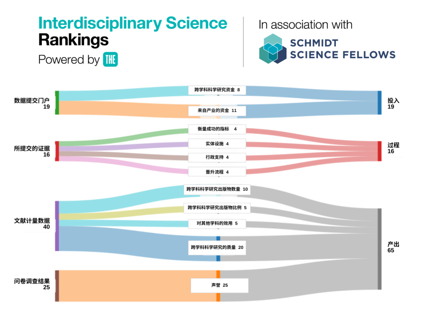 跨学科科学排名的评估方法论基于三大支柱,每个支柱代表研究项目生命周期的一个阶段即投入(资金支持)、流程(成功衡量标准、设施建设、行政支持和推广机制)以及产出(学术出版物、研究质量和声誉)。