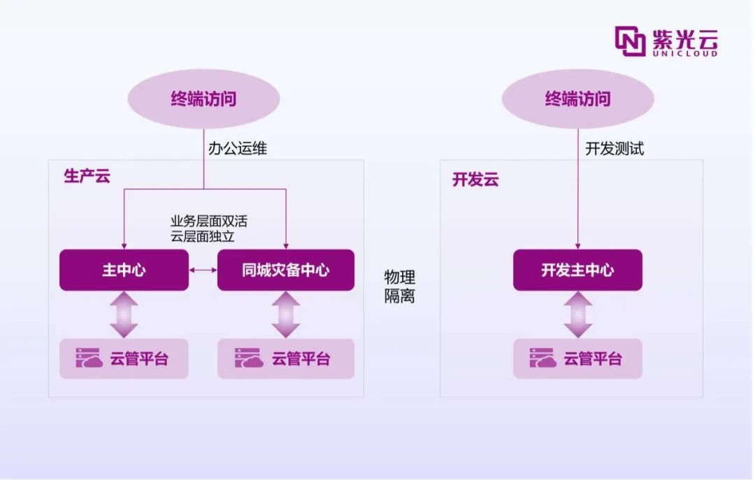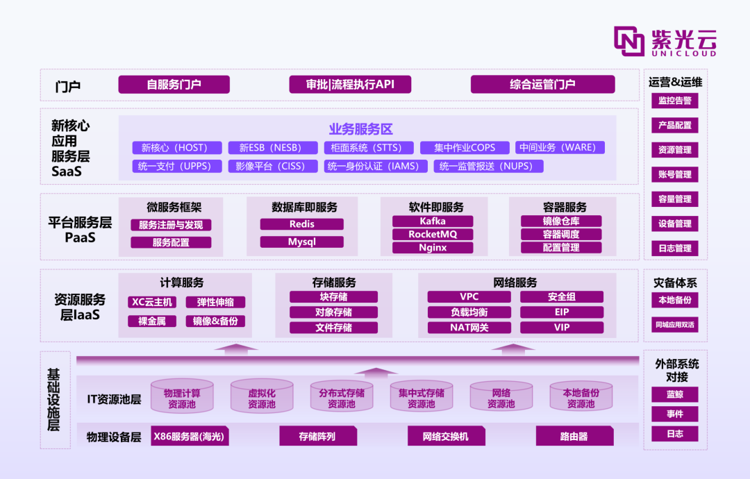 为满足监管要求,赣州银行于2023年底启动了生产及开发测试云的建设工作,布局业务的同城双活。随后,在2024年3月中旬,紫光云开始交付云资源,并着手进行核心业务系统的上云及业务测试。经过一系列严格的测试,新的核心业务系统成功完成测试阶段,并在11月初顺利正式上线,在技术层面,紫光云提供了IaaS+PaaS支撑,部署了大量的云主机,并提供了一站式、数据库、中间件等高级服务,以支持应用的运行。