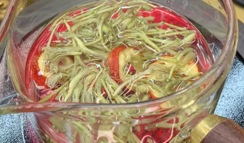 金银花、山楂洗净,放入养生壶中,加入适量清水,大火煮沸。