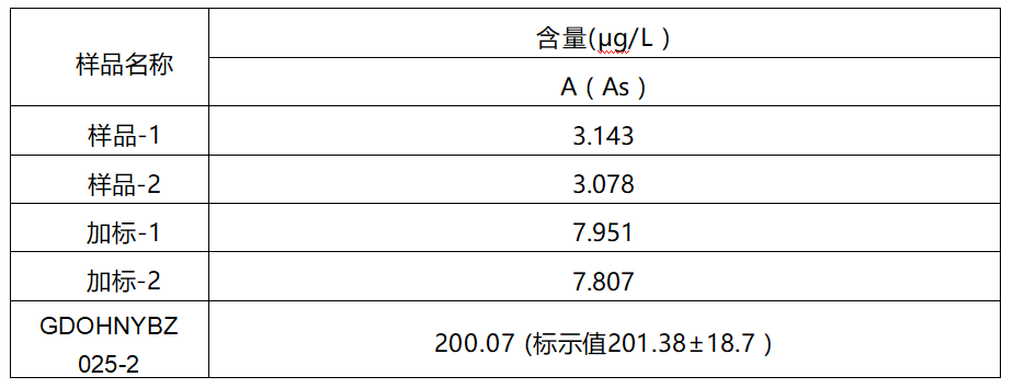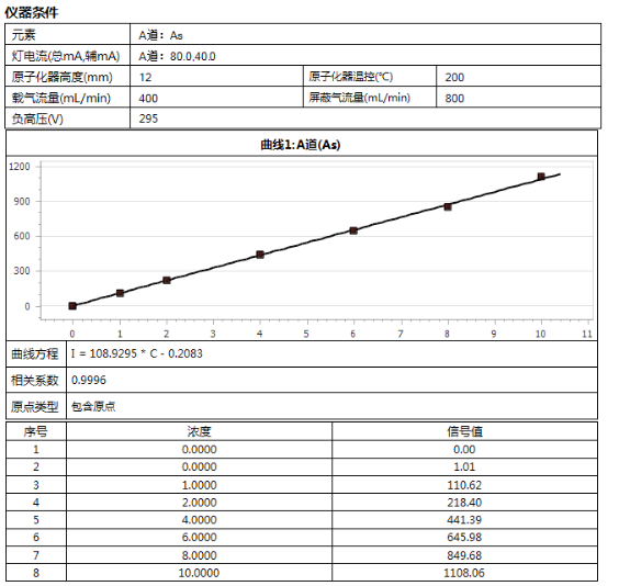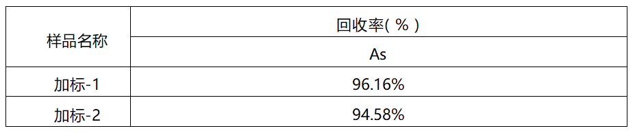 测试结果显示:应用北京吉天仪器有限公司的 Kylin S12原子荧光光度计可以很好的测定尿液中砷含量 ,线性关系为0.9996 ;重复性RSD为 0.34% ;加标回收率为94.58% ~ 96.16% ,仪器检出限0.027ng/mL ,质控样品GDOHNYBZ025-2的砷测定值在真值附近。