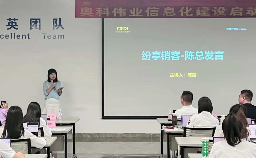 奥科伟业董事长汤智娇、总经办贺峰、唐韧、金国祥以及纷享销客中南战区副总经理陈雷等出席。同时公司中层及全体销售均积极参会,共同见证这一重要时刻。会议由奥科伟业CRM项目负责人、国内营销副总邓珊珊主持,她以热情洋溢的开场词,拉开了本次启动会的序幕。