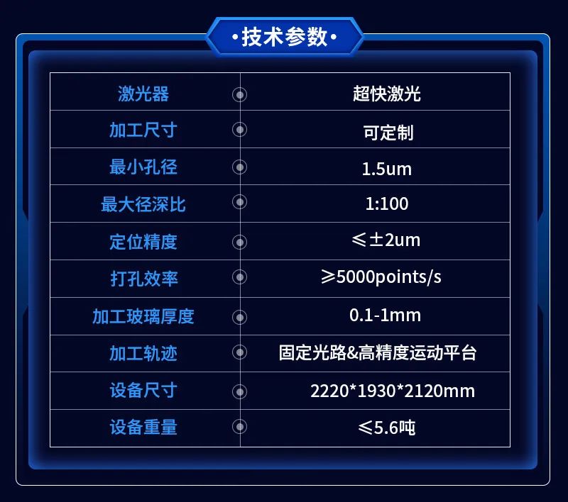 截至目前,利元亨半导体玻璃激光穿孔设备在多个核心性能指标上达到了行业领先水平,为先进封装技术的发展提供了强有力的支持。以下是该设备的关键性能特点: