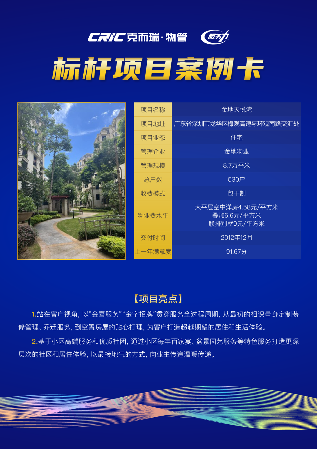 为深入挖掘和整理行业的卓越实践,为物业管理行业的高质量发展积累宝贵经验和智慧,克而瑞物管于年内启动『2025中国物业服务力标杆100』的研究。近日,金地智慧服务集团粤闽区域公司在管项目金地·天悦湾凭借超预期的居住体验作为标杆项目案例入选该研究(点击文章底部“阅读原文”查看该研究)。