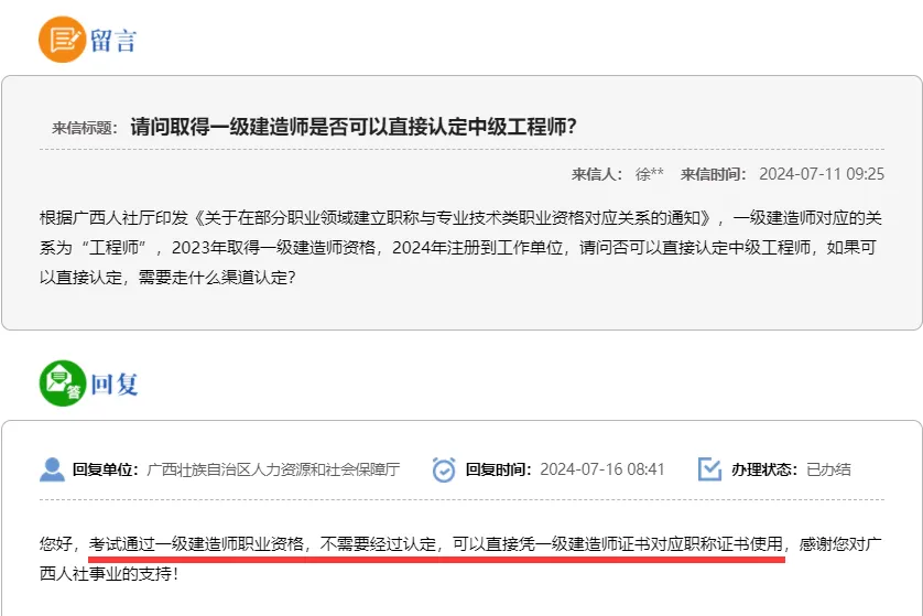 广西人社厅:取得一级建造师,不需认定,可直接对应中级职称!