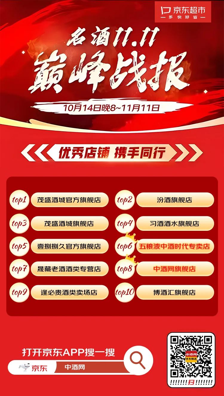 在11月12日京东商城发布的双11销售战报中,中酒网旗舰店和五粮液中酒时代专卖店携手闯入销售榜前十。