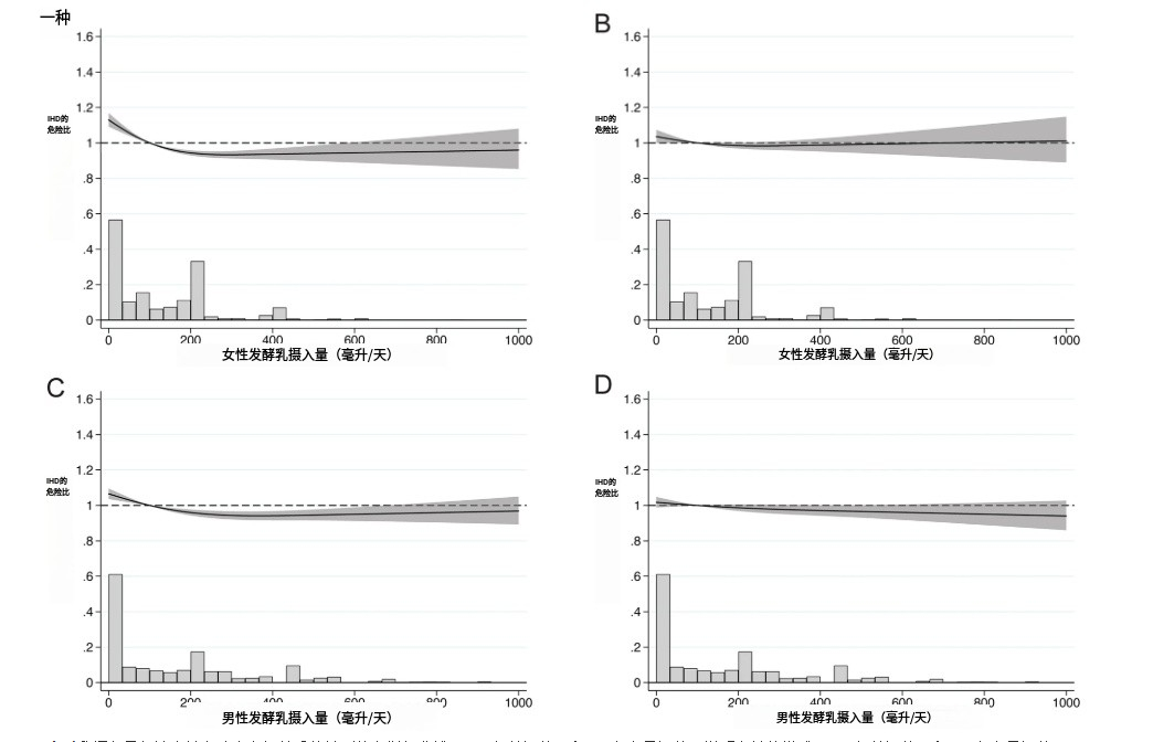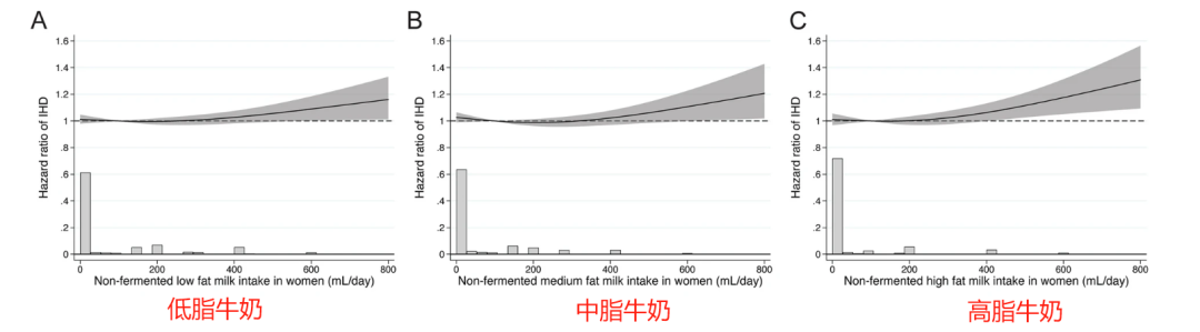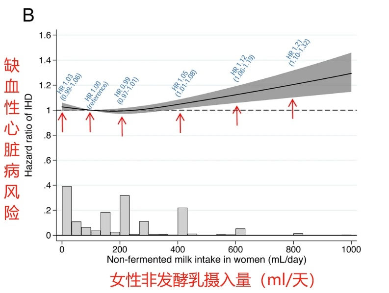实验发现,女性摄入大量非发酵乳与缺血性心脏病发生风险呈正相关。非发酵乳的摄入量与女性罹患缺铁性心脏病的风险之间存在着非线性关系。其中,300mL/天是拐点。当每日的摄入量不足300mL时,患病率会随着摄入量的增加而有所下降,但当摄入量超过300mL/天之后,摄入量越高,患病率也会随之增加。研究发现,无论牛奶的脂肪含量(全脂、中脂、低脂)如何,女性牛奶摄入量的增加,都会增加缺血性心脏病的风险。同样,“安全线”位于300mL/天。研究者发现,用适量发酵乳(酸奶)摄入量代替非发酵乳可以降低女性缺血性心脏病和心肌梗塞的风险。