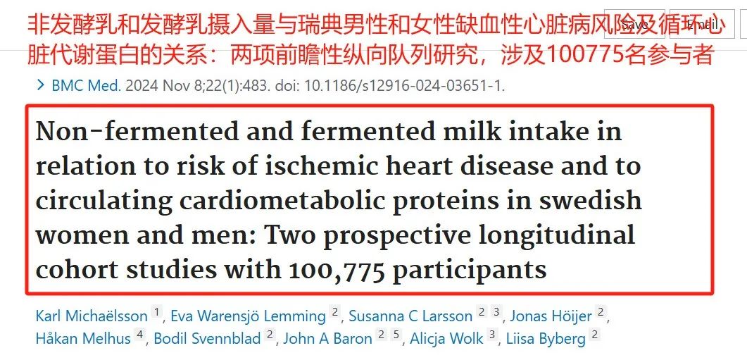 [1]Michaëlsson, K., Lemming, E. W., Larsson, S. C., Höijer, J., Melhus, H., Svennblad, B., ... & Byberg, L. (2024). Non-fermented and fermented milk intake in relation to risk of ischemic heart disease and to circulating cardiometabolic proteins in swedish women and men: Two prospective longitudinal cohort studies with 100,775 participants. BMC medicine, 22(1), 483.