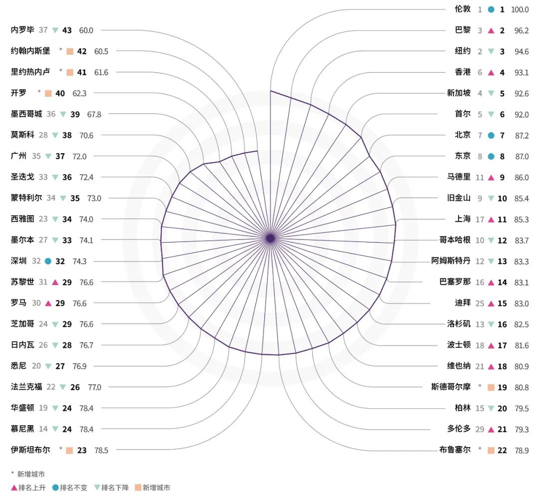2024年报告沿用了由吸引力、影响力、联通力3个一级指标和11个二级指标、25个三级指标构成的评估框架,并进行了局部优化调整,同时参考数据可得性和地区代表性等因素,新增了布鲁塞尔、斯德哥尔摩、伊斯坦布尔、里约热内卢、开罗、约翰内斯堡等6个样本城市,总样本数扩大至43个。报告指出,国际交往中心城市是具备联通和服务世界功能、能够集聚国际高端要素、在全球事务中发挥重要影响的城市,是国际交往网络中的关键性节点和枢纽性平台。