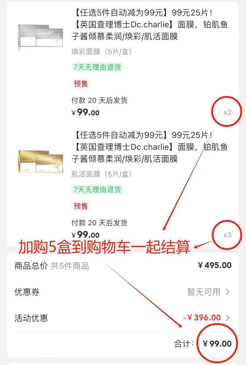 三款面膜任选5盒,加入购物车自动减价,实付99元,到手整整5盒!