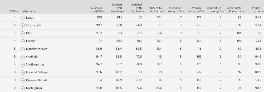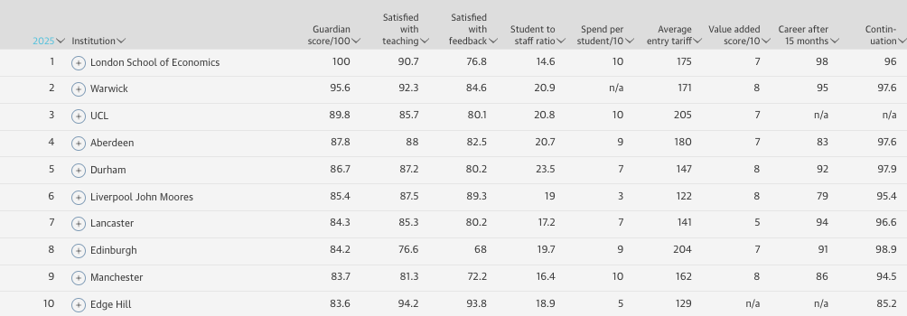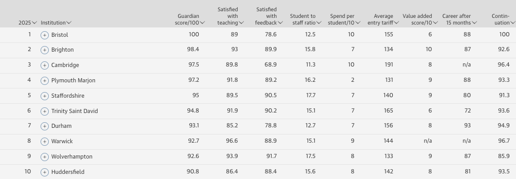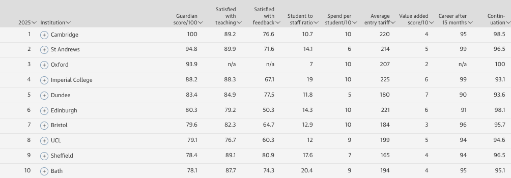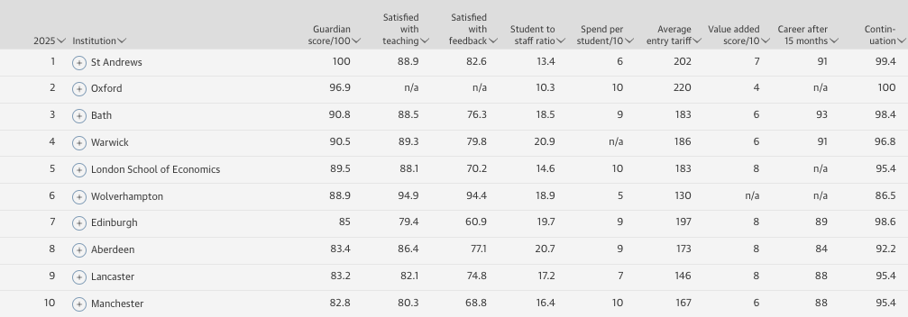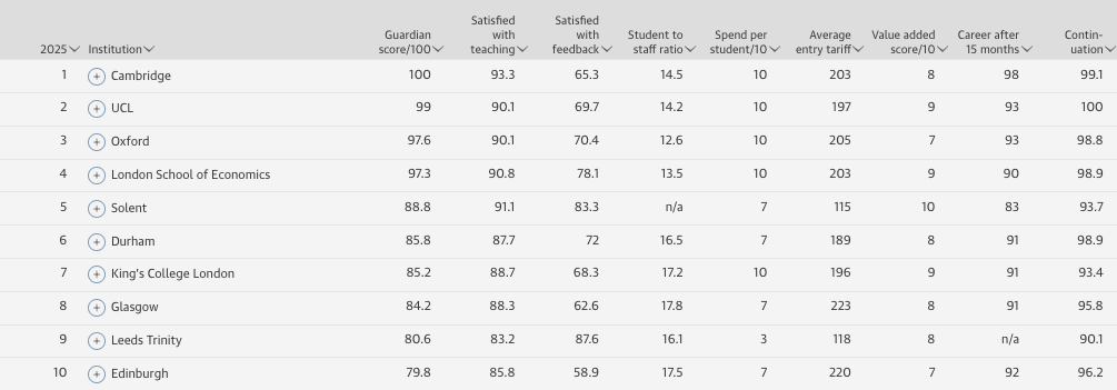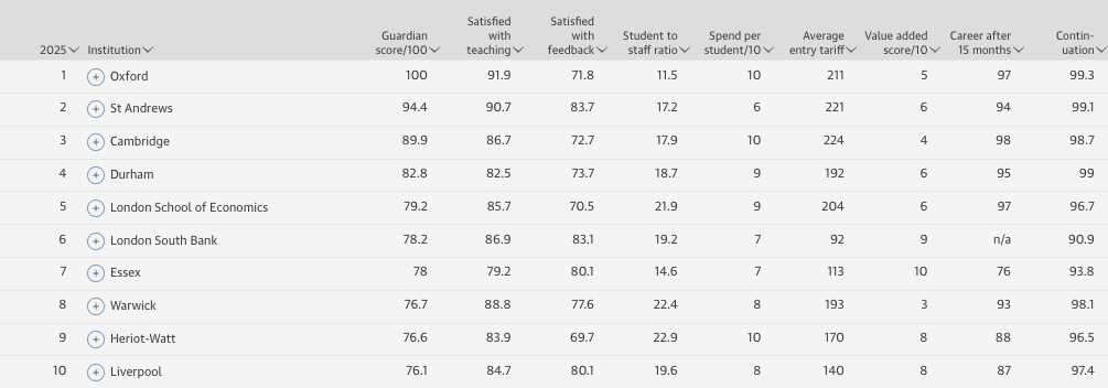 2025《卫报》英国大学排名Top10