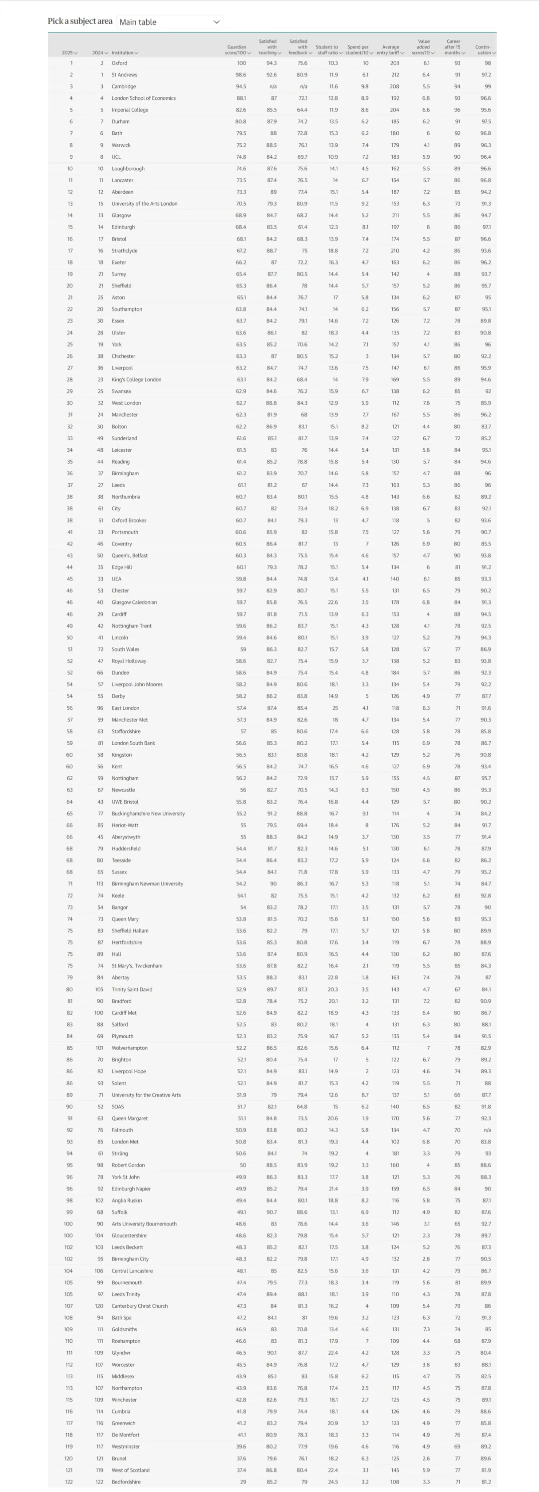 2025年《卫报》英国大学排名