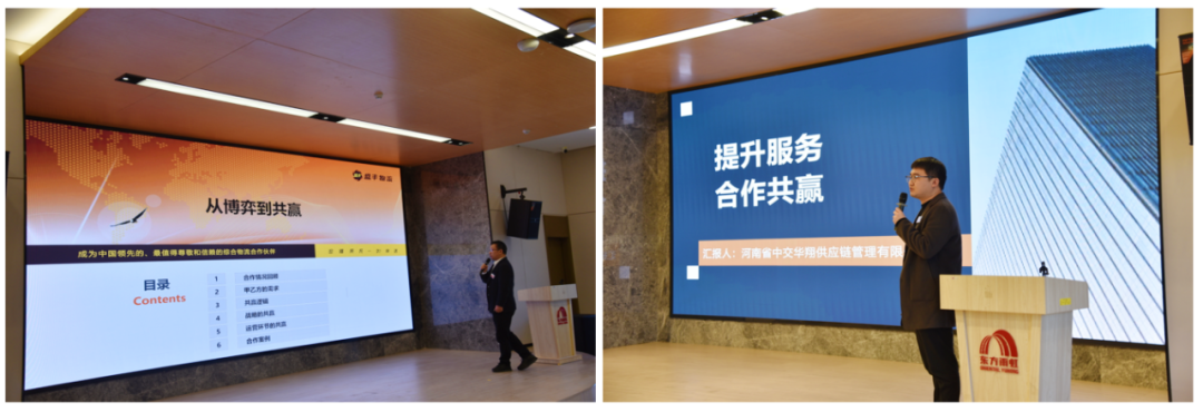 在分享环节中,东方雨虹物流合作伙伴——盛丰物流集团有限公司以“从博弈到共赢”为主题,分享如何在甲乙双方需求中求共同点,并通过沟通与优化实现降低成本、提高效率、协同发展的宝贵经验;河南省中交华翔供应链管理有限公司则以“提升服务合作共赢”为主题,重点围绕服务为本、服务前置、服务多元化等方面进行分享、交流。
