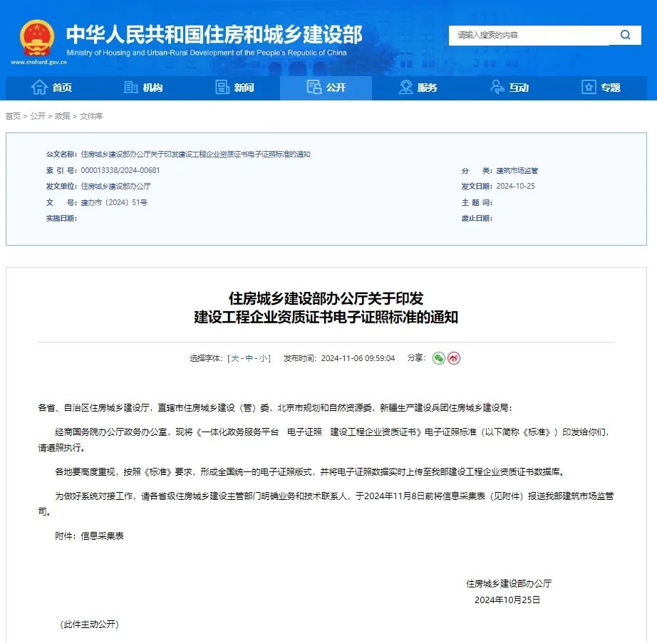 近日,住建部发布了关于建工企业资质电子证照标准通知(以下简称通知),一起来看看吧!