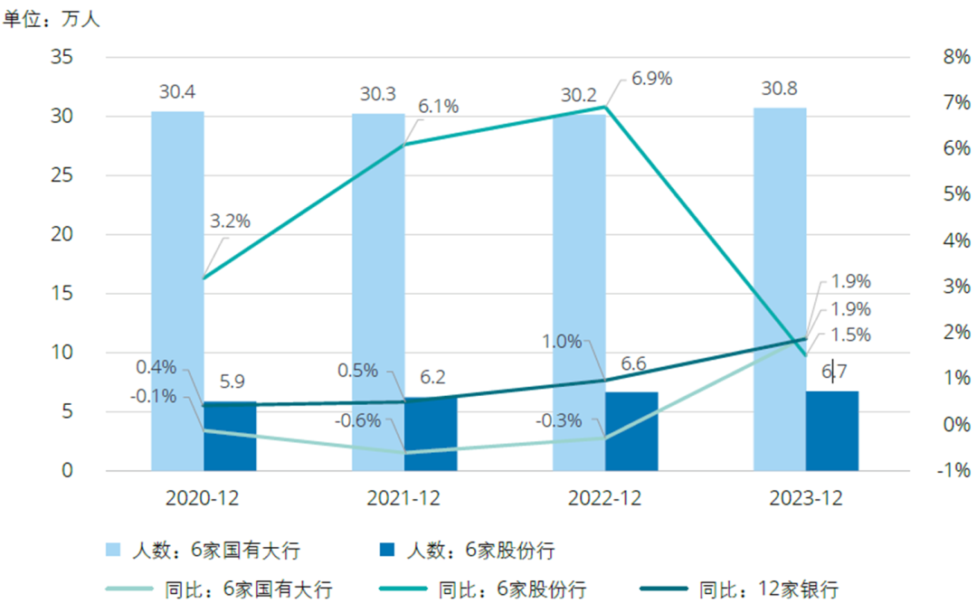 6家国有大行加大了对人员规模的控制力度,均值稳定在30万人左右。相比之下,6家股份行人才资源投入稳中有升,2023年末员工数量均值达6.7万人,同比增加1.5%。