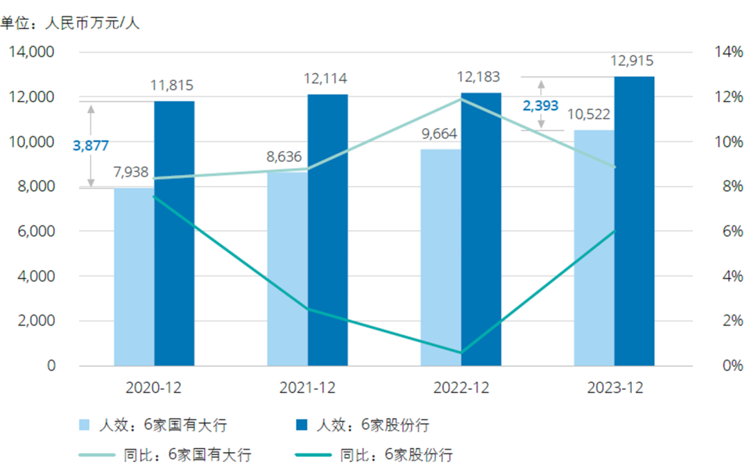 2020年-2023年,6家国有大行人均资产规模均值持续低于6家股份行。但6家国有大行各阶段同比增速高于6家股份行,且增速差异逐步扩大,人均资产规模差异由2020年末3,877万元/人缩减为2023年末2,393万元/人。