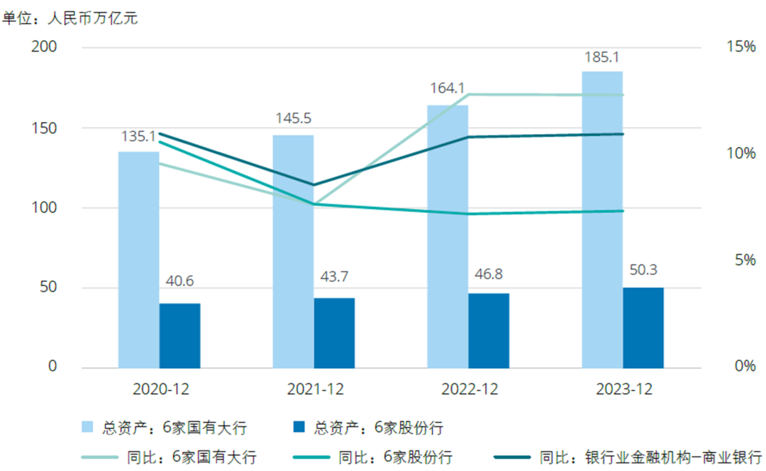 整体来看,银行业金融机构——商业银行总资产稳步增加,2023年末总资产达354.8万亿元,同比增速除2021年外,均维持在10%以上。其中,6家国有大行2022年和2023年总资产同比增速维持在10%以上,略高于同期商业银行整体水平。6家股份行总资产增速相对较慢。