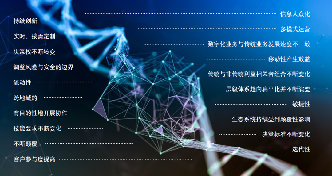 数字化转型并非单纯的新技术革命,更为重要的是涉及人的思维模式的转变。只有企业整体文化与数字化转型举措相匹配,才能更好地推进数字化转型。银行业过往企业文化相对传统,风险规避意识较高。而领先的数字化企业文化则呈现出“持续创新、决策权不断转变、不断颠覆、移动性产出效益”的特征,德勤总结了23条成熟数字化组织的特征,即数字化“DNA”,为银行审视数字化转型中的文化转型成果提供了标杆。