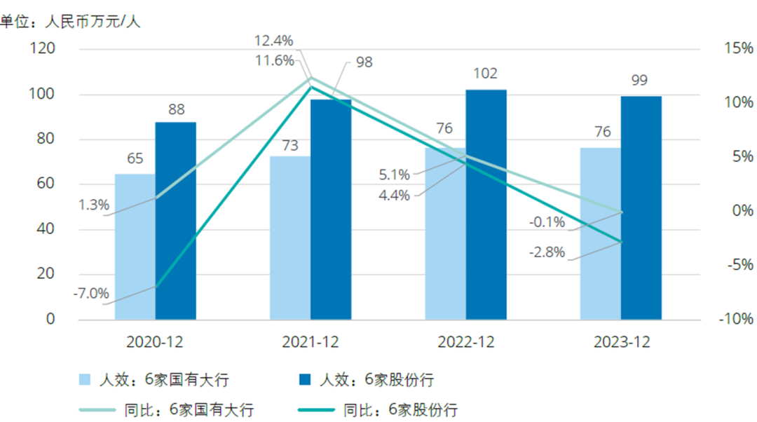 2020-2023年6家国有大行和6家股份行人均净利润均值呈缓慢上涨趋势,2023年略有下降,变化幅度呈先增长后下降趋势。相较而言,2023年6家股份行人均净利润绝对值高于国有6大行,但人均净利润降幅较国有6大行更大。