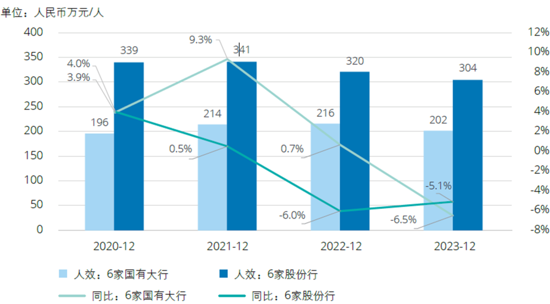 2020-2022年6家国有大行人均营收均值稳中有升,但2023年末下降至202万元/人。6家股份行人均营收均值整体呈下降趋势,人均营收均值由2020年末的339万元/人下降至2023年末的304万元/人。