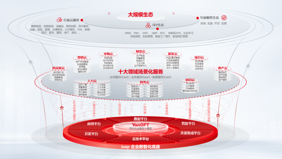 行业应用与服务生态包括了越来越丰富的细分行业及细分领域应用,以及在用友BIP基础上的共同服务企业数智化的多元增值服务;